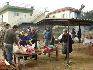 "και τ' χρόν' παχύτερο" Επίσης την παραμονή των Χριστουγέννων, άλλοι σφάζανε τα γουρούνια και άλλοι τα χτυπάγανε στο κεφάλι με το τσεκούρι. Την επόμενη των Χριστουγέννων βγάζανε το λίπος, το κόβανε σε κομμάτια και το βάζανε σ’ένα καζάνι που το τοποθετούσαν στη φωτιά, το λιώνανε, του βγάζανε τις τσιγαρίδες, το βάζανε σε τενεκέδες και το χρησιμοποιούσαν σε διάφορα φαγητά όλη τη χρονιά.